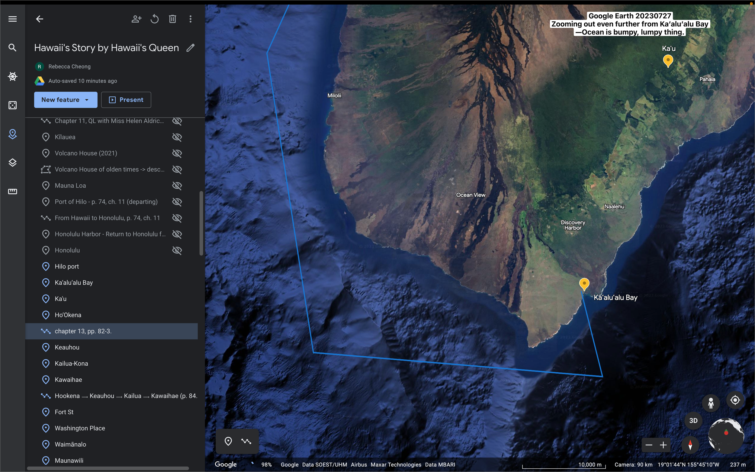 I was pulled to envision places that Liliuokalani named because of how various places proliferated throughout the text. Mapping these places on Google Earth became a way to “manage” the countless places she mentions in the memoir. Google Earth made it convenient to drop pins onto the map each time I came across the name of a place.
